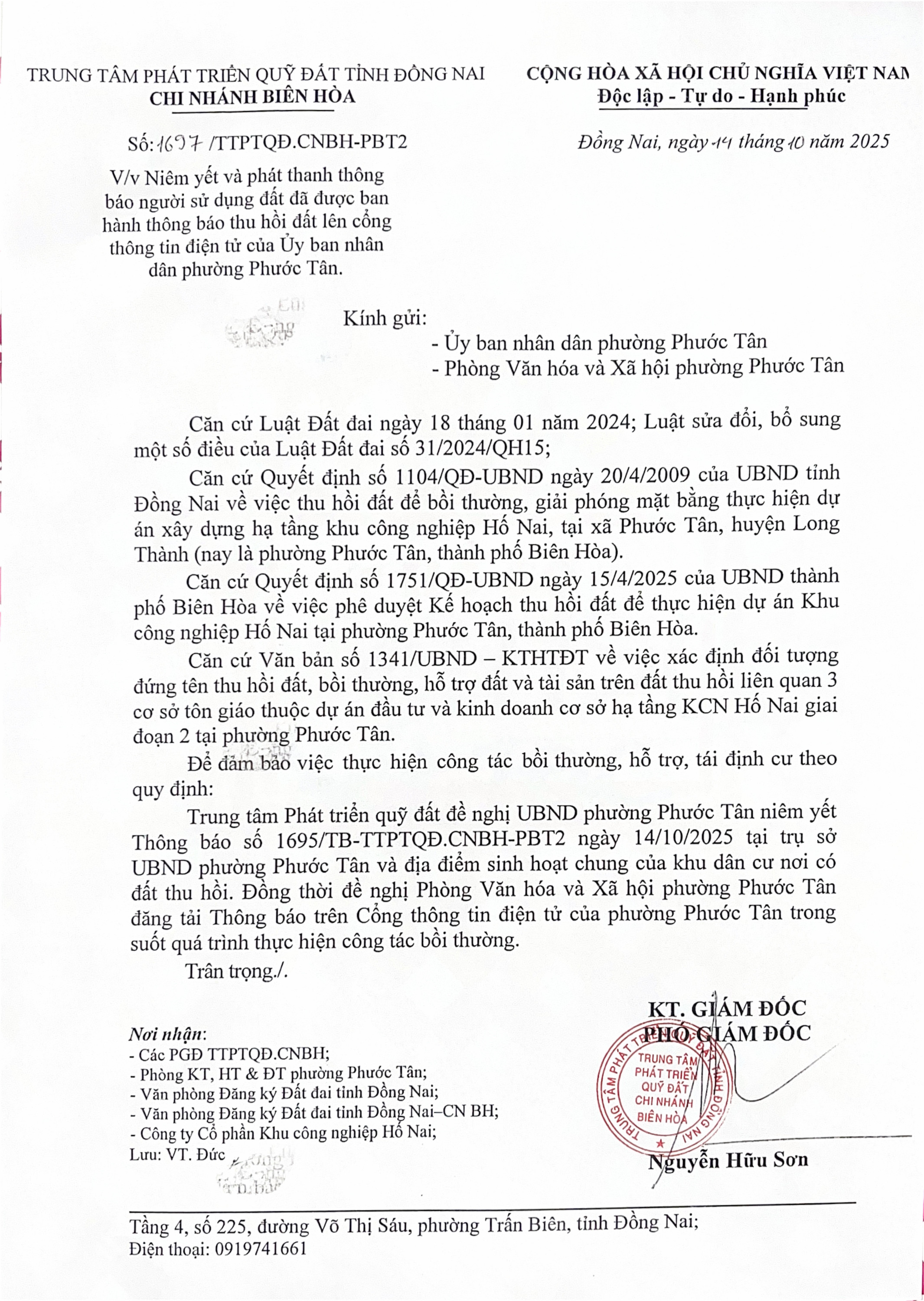 Thông báo thu hồi đất để thực hiện dự án xây dựng hạ tầng khu công nghiệp Hố Nai (giai đoạn 2) tại phường Phước Tân