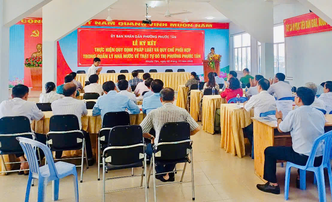 Sáng ngày 02 tháng 10 năm 2025, tại Hội trường UBND phường Phước Tân, Ủy ban nhân dân phường Phước Tân đã tổ chức Lễ ký kết phong trào thi đua thực hiện quy định pháp luật và Quy chế phối hợp trong công tác quản lý nhà nước về trật tự đô thị.
