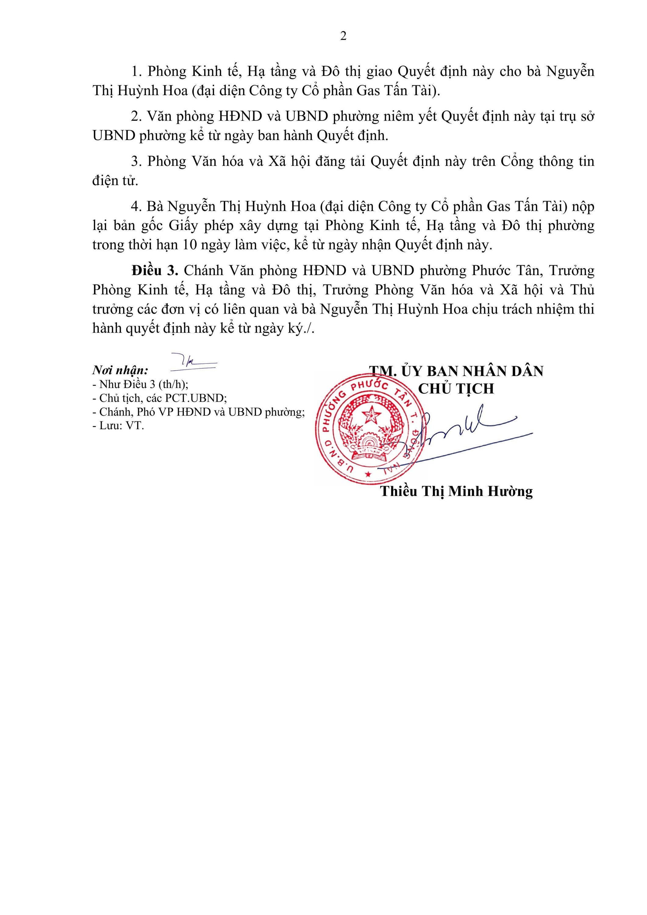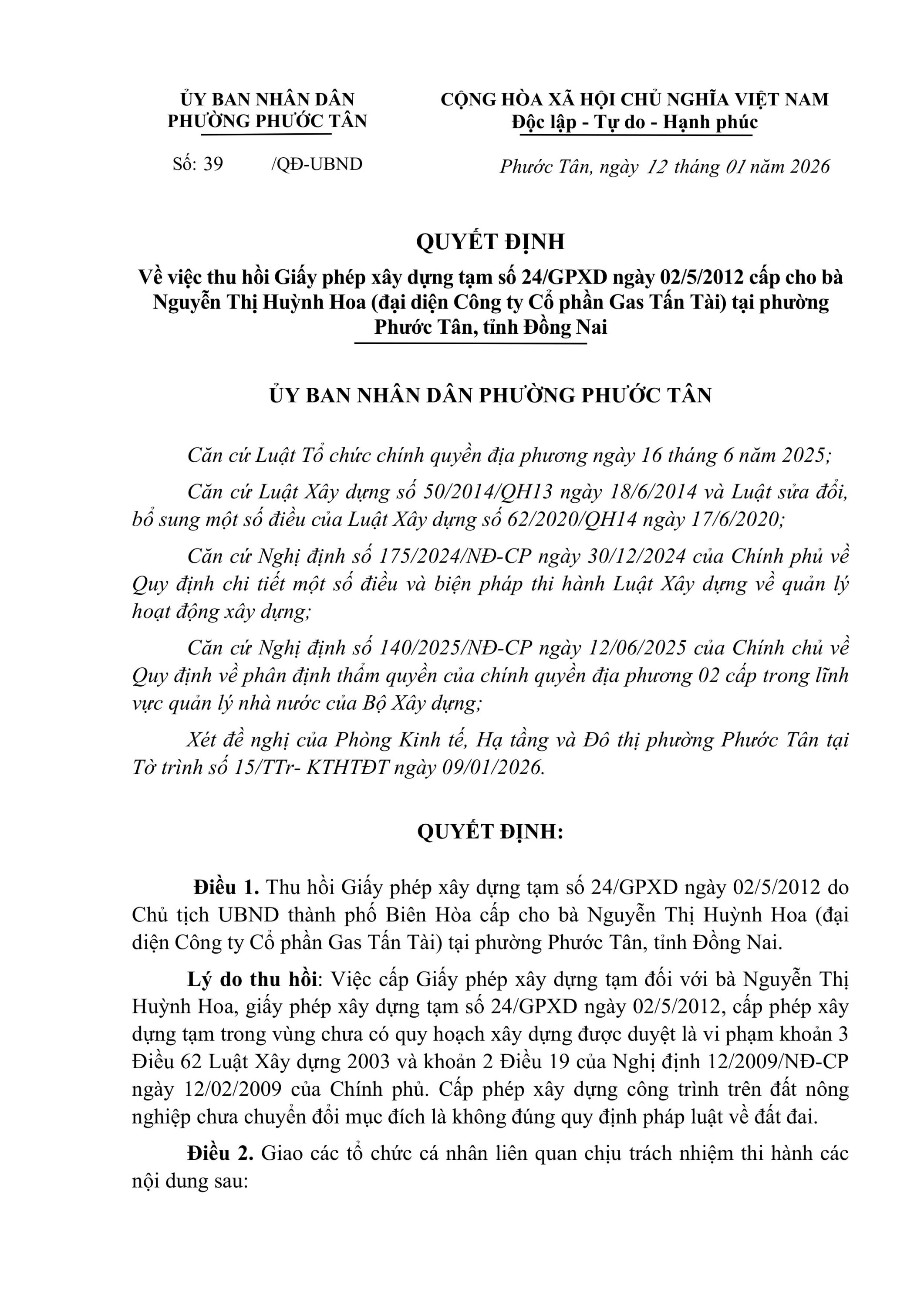 39/QĐ-UBND: Về việc thu hồi Giấy phép xây dựng tạm số 24/GPXD ngày 02/5/2012 cấp cho bà Nguyễn Thị Huỳnh Hoa (đại diện Công ty Cổ phần Gas Tấn Tài) tại phường Phước Tân, tỉnh Đồng Nai.
