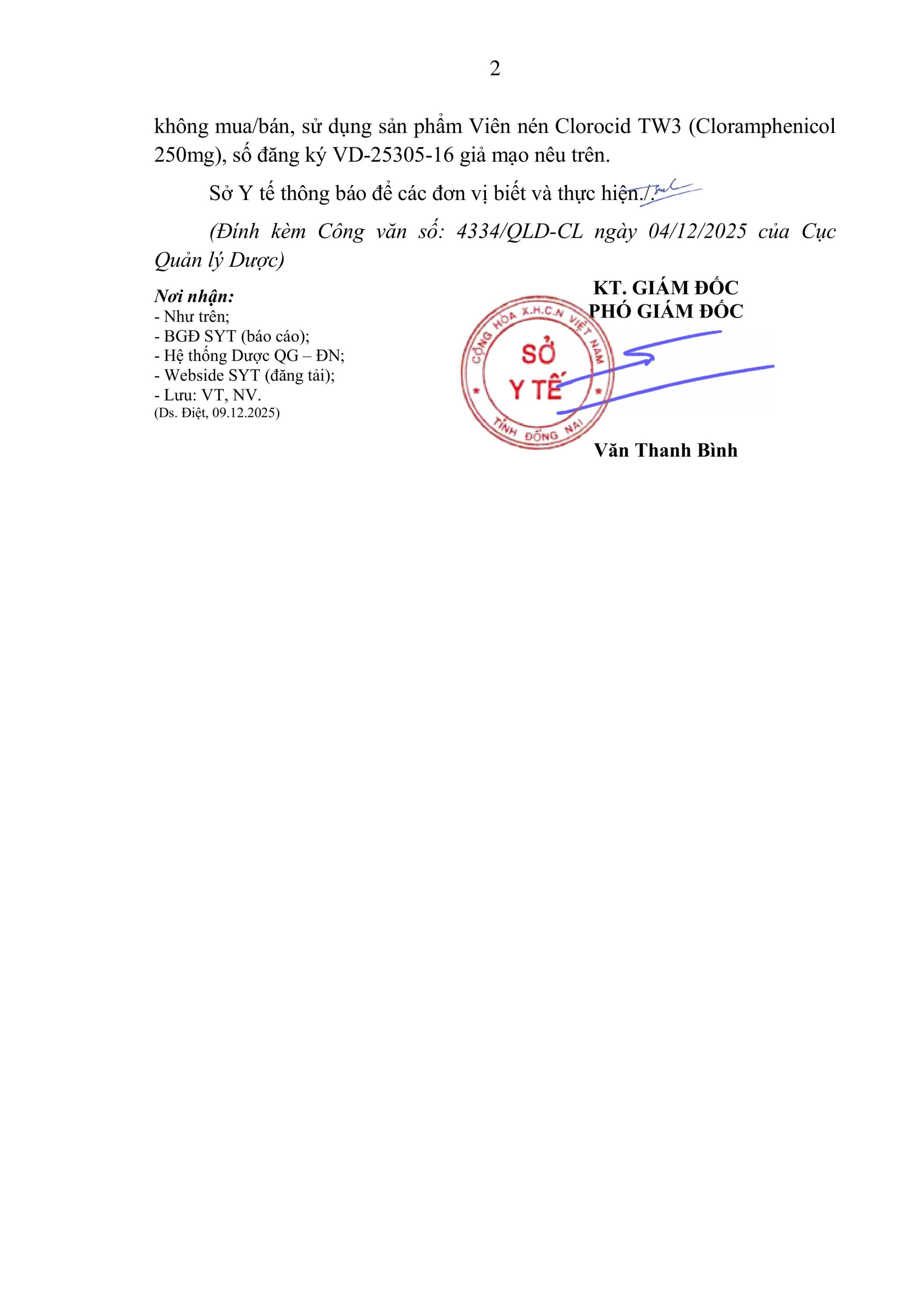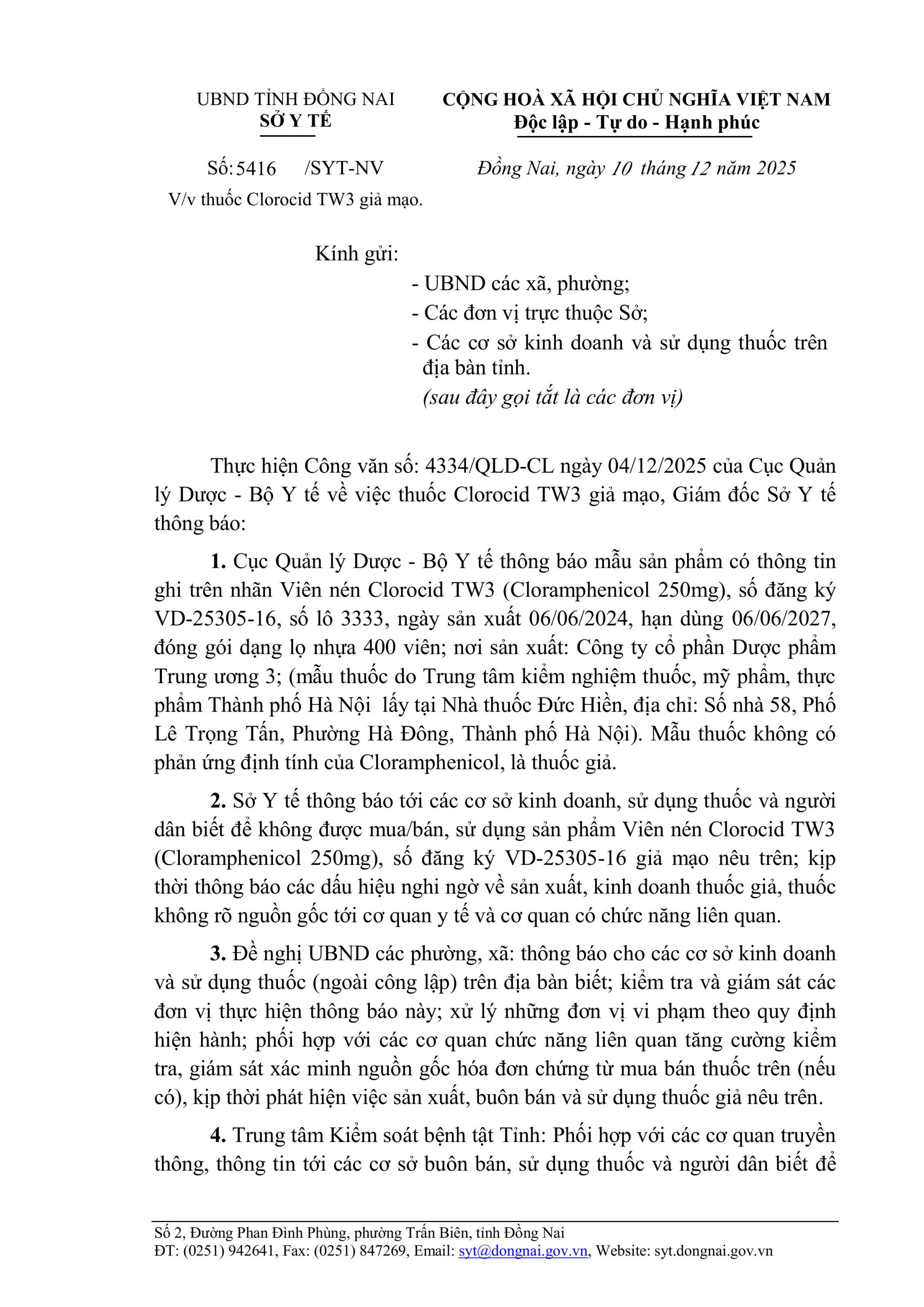 Thực hiện Công văn số: 4334/QLD-CL ngày 04/12/2025 của Cục Quản lý Dược - Bộ Y tế về việc thuốc Clorocid TW3 giả mạo, Giám đốc Sở Y tế