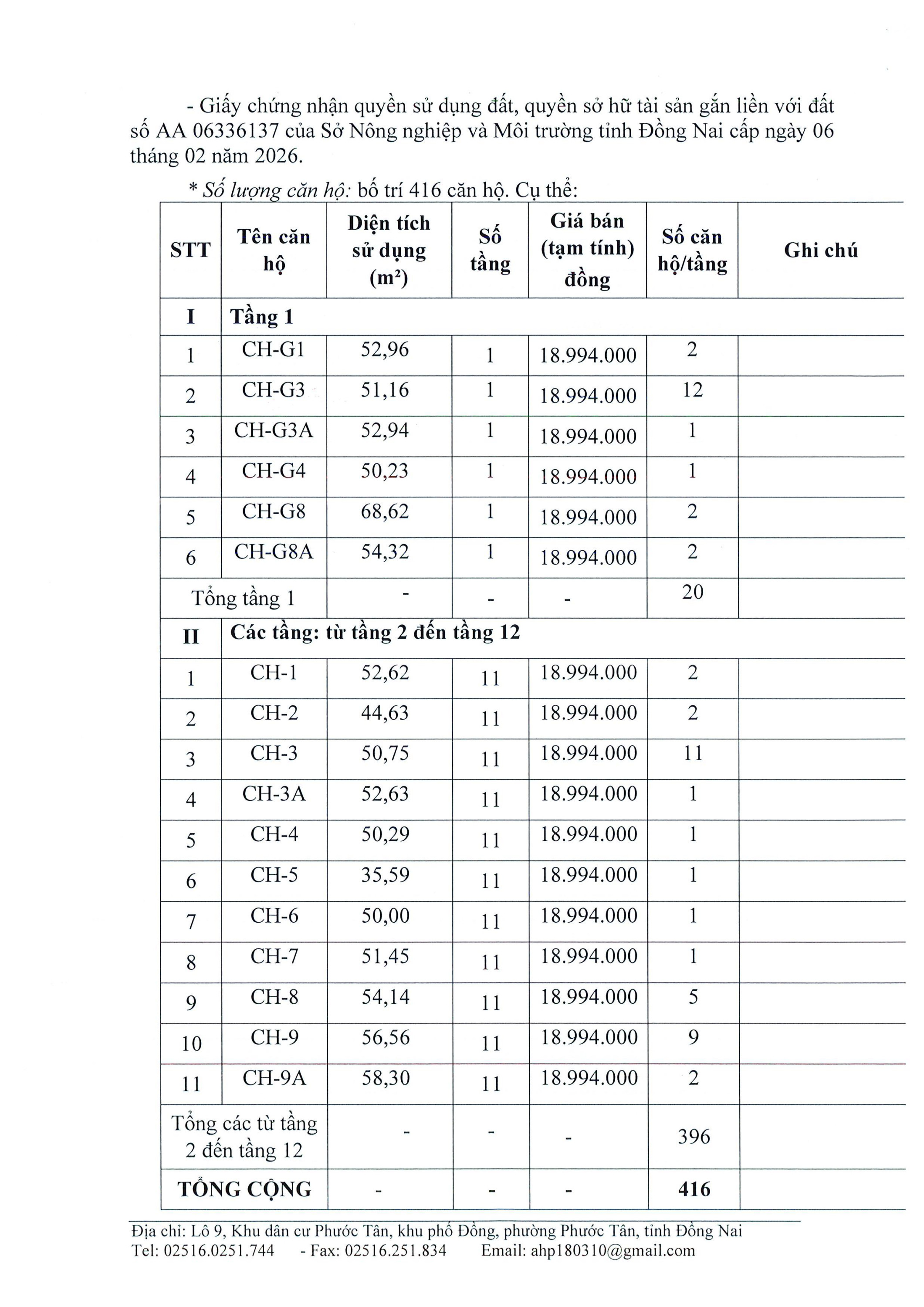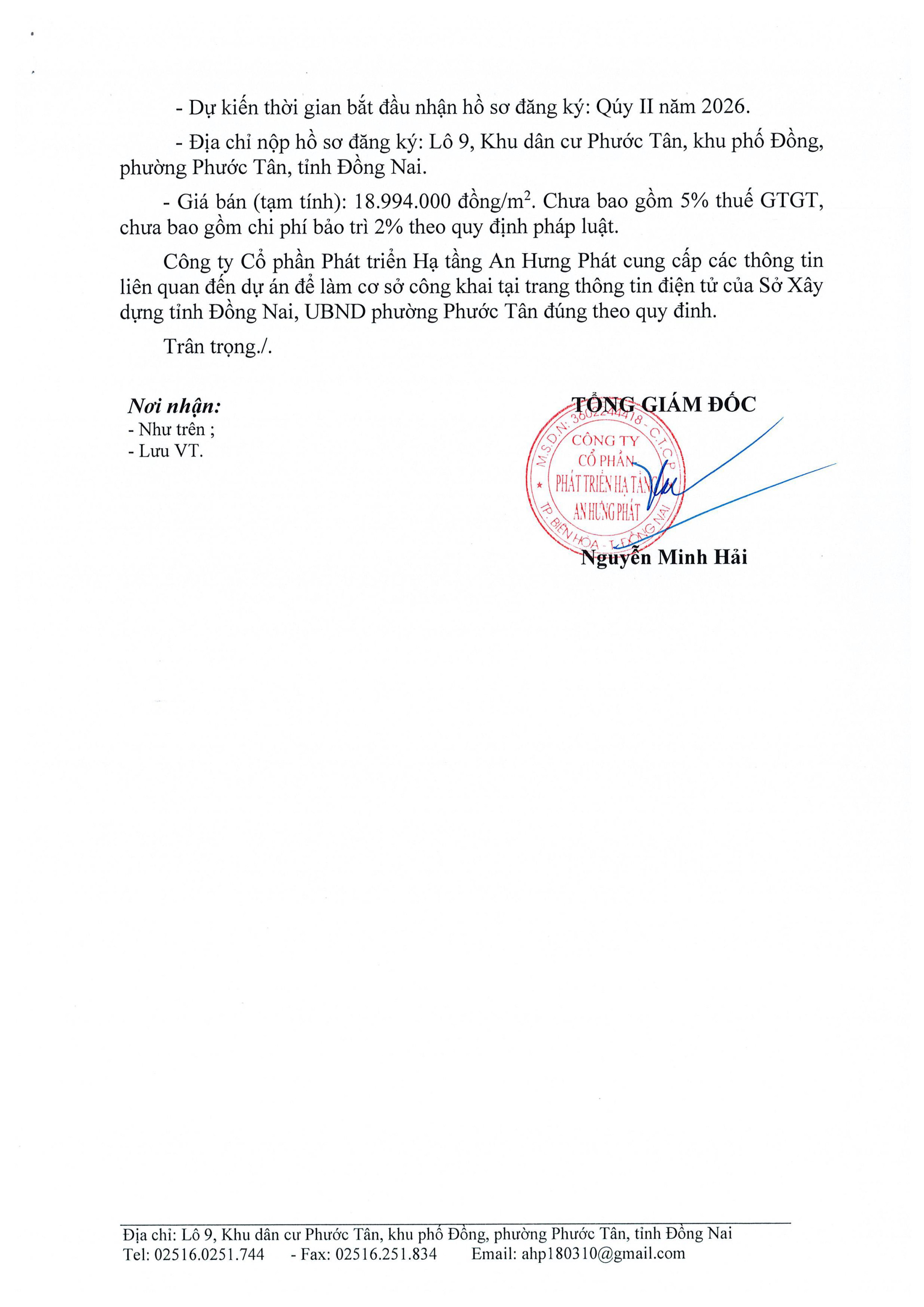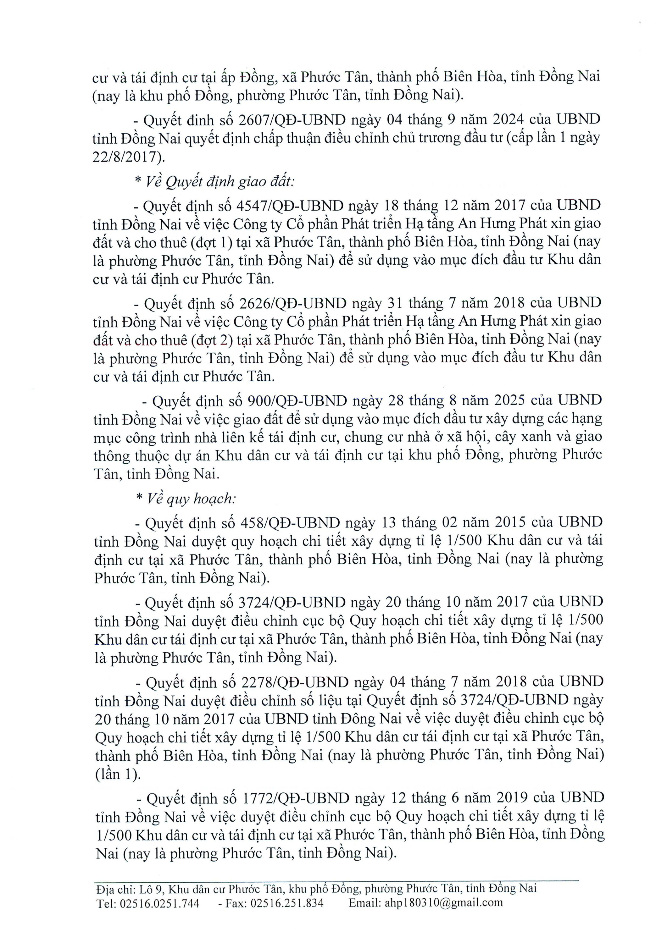Sau khi kiểm tra hồ sơ các dự án do Công ty Cổ phần Phát triển Hạ tầng An Hưng Phát làm chủ đầu tư trên địa bàn tỉnh Đồng Nai, nay đơn vị cung cấp các thông tin liên quan đến chung cư nhà ở xã hội NXH2 – Khối B thuộc dự án Khu dân cư và tái định cư phường Phước Tân, tỉnh Đồng Nai cụ thể như sau: