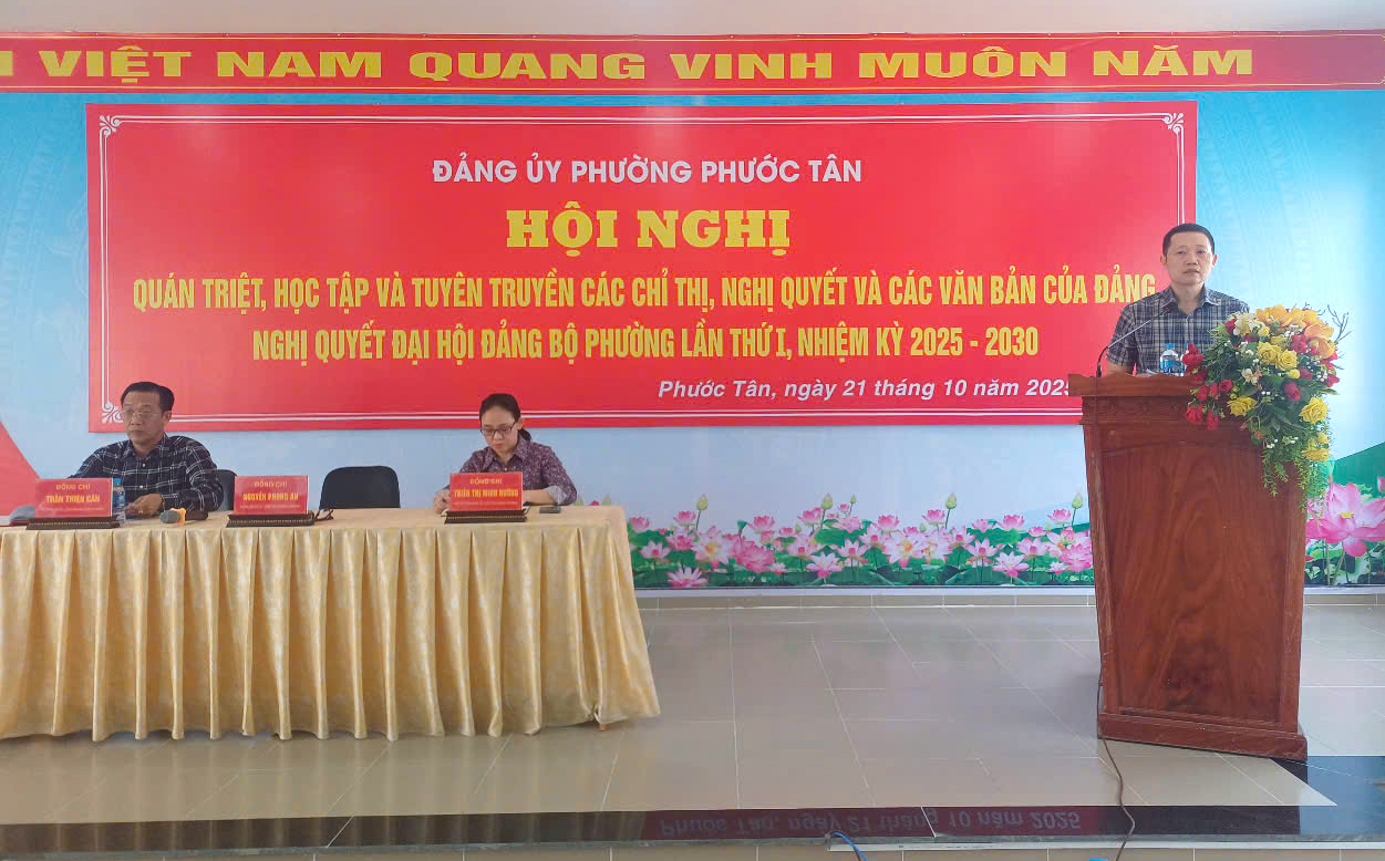 Thực hiện Kế hoạch của Tỉnh ủy Đồng Nai về tổ chức học tập, quán triệt và triển khai thực hiện các chỉ thị, nghị quyết của Đảng, sáng ngày 21/10/2025, Đảng ủy phường Phước Tân tổ chức Hội nghị quán triệt, học tập và tuyên truyền các chỉ thị, nghị quyết và các văn bản mới của Trung ương, Tỉnh ủy cho toàn thể cán bộ, đảng viên trong toàn Đảng bộ.