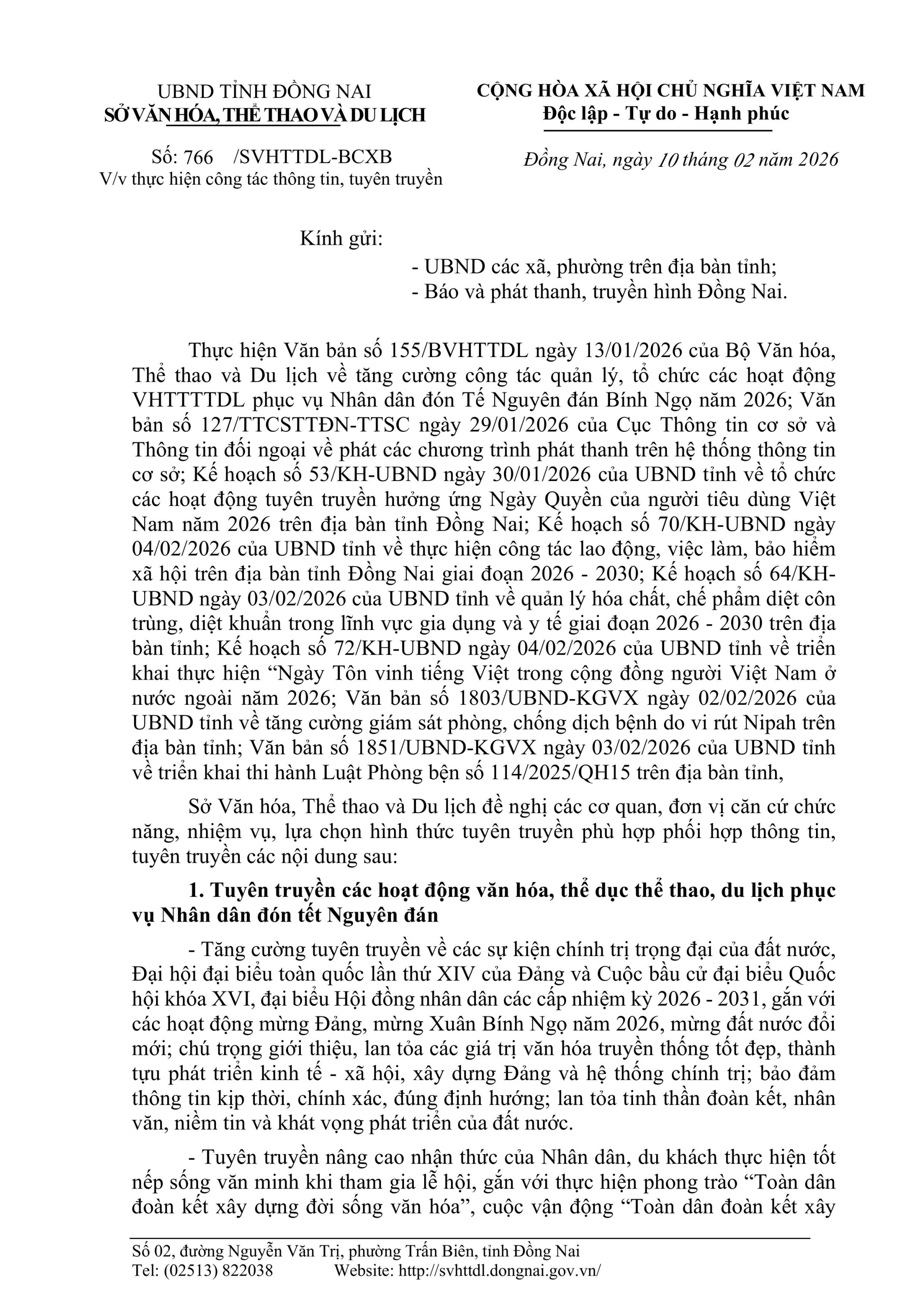 Sở Văn hóa, Thể thao và Du lịch đề nghị các cơ quan, đơn vị căn cứ chức năng, nhiệm vụ, lựa chọn hình thức tuyên truyền phù hợp phối hợp thông tin, tuyên truyền các nội dung sau:
