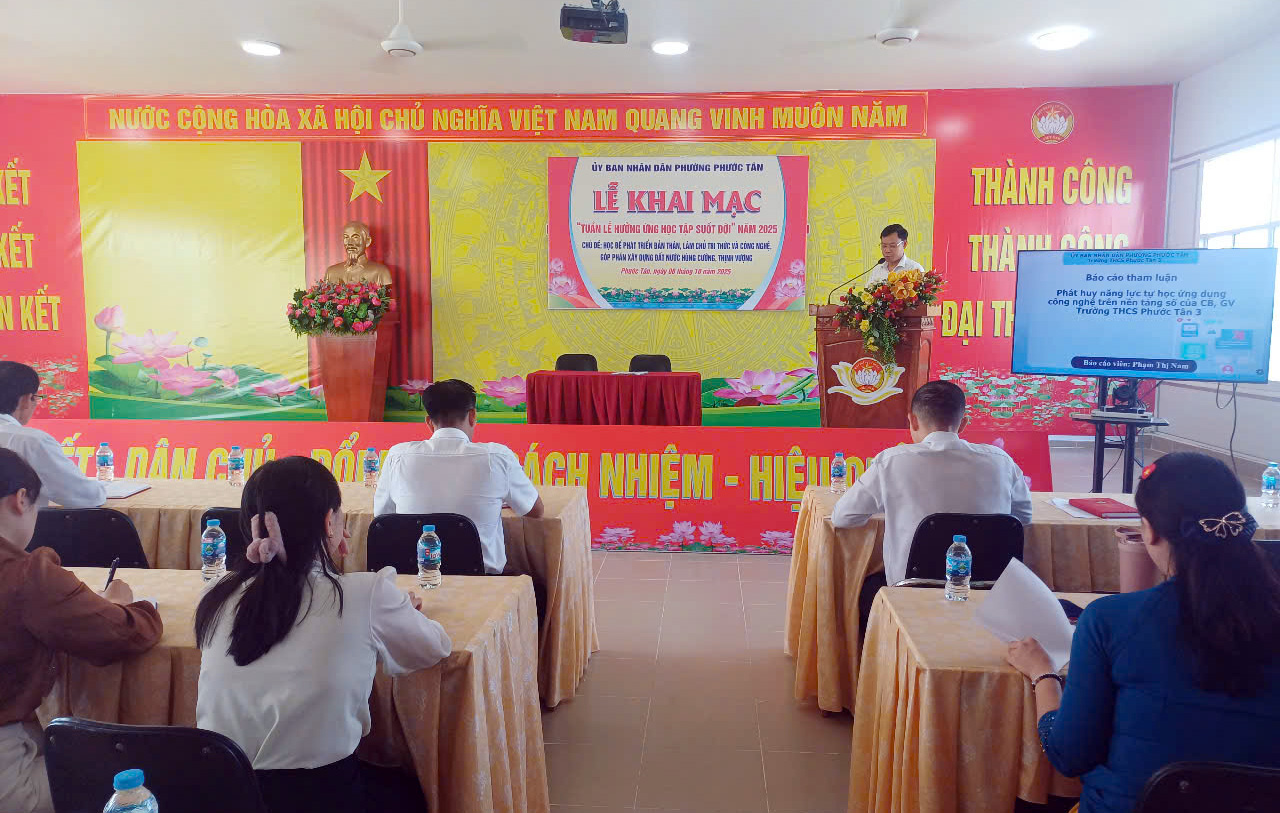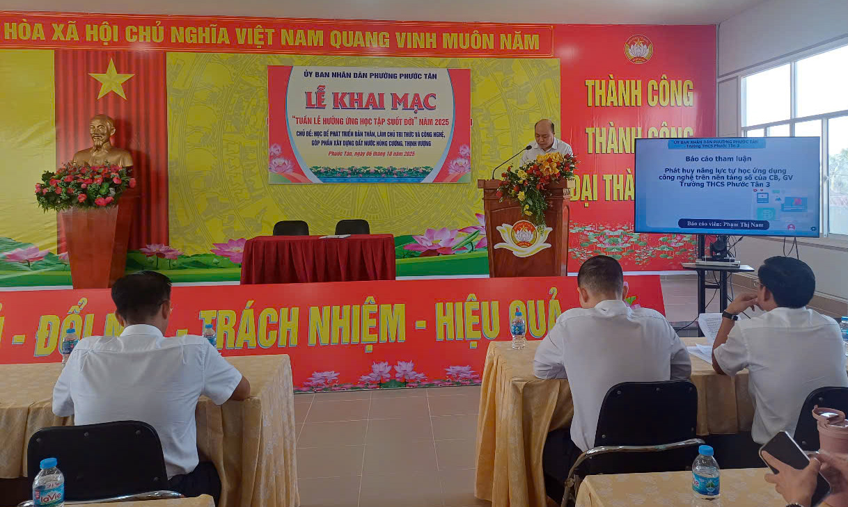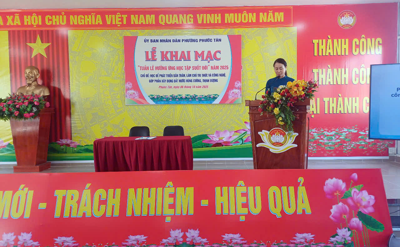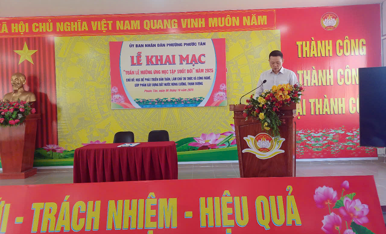 Hưởng ứng Tuần lễ hưởng ứng học tập suốt đời năm 2025 với chủ đề “Học để phát triển bản thân, làm chủ tri thức và công nghệ, góp phần xây dựng đất nước hùng cường, thịnh vượng”, sáng ngày 06 tháng 10 năm 2025, UBND phường Phước Tân đã tổ chức Lễ khai mạc và triển khai nhiều hoạt động thiết thực nhằm khuyến khích cán bộ, đảng viên và nhân dân tham gia học tập thường xuyên, học tập liên tục và học tập suốt đời.